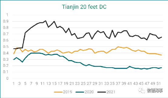 天津港20尺高箱的CAX指數。數據來源:Container Xchange