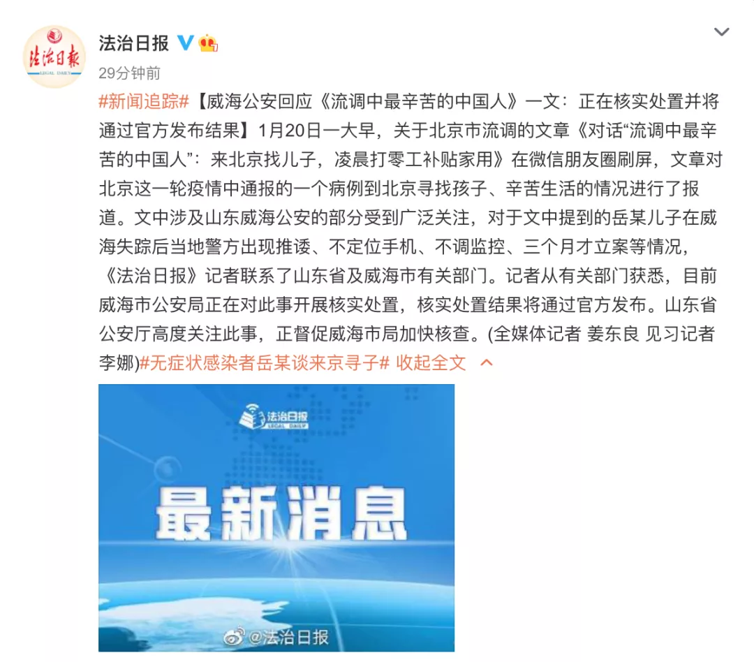 ▲《法治日報》從相關部門獲悉,目前威海市公安局正在對此事開展核實處置,核實處置結果將通過官方發佈。