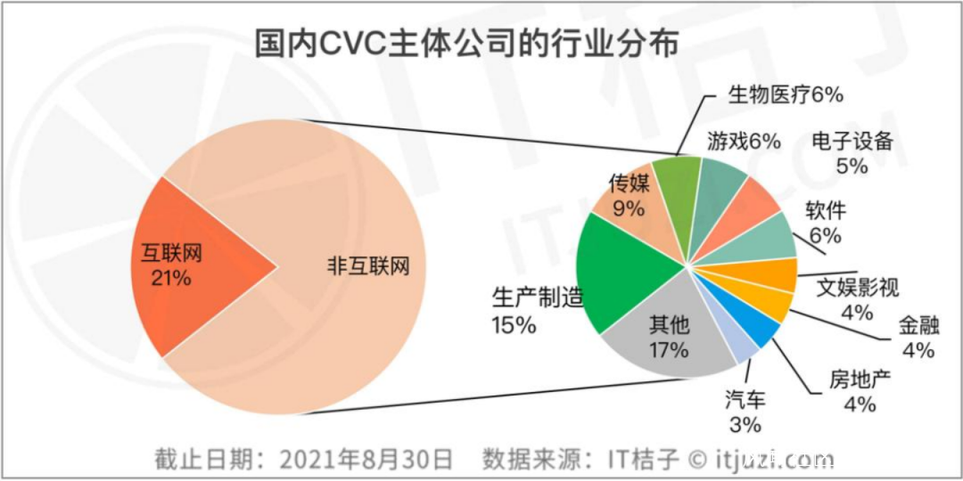 據IT桔子數據顯示,截至2021年8月,國內CVC主體公司的五分之一仍是互聯網企業,而在其餘近八成中,有15%的CVC主體公司來自生產製造行業。