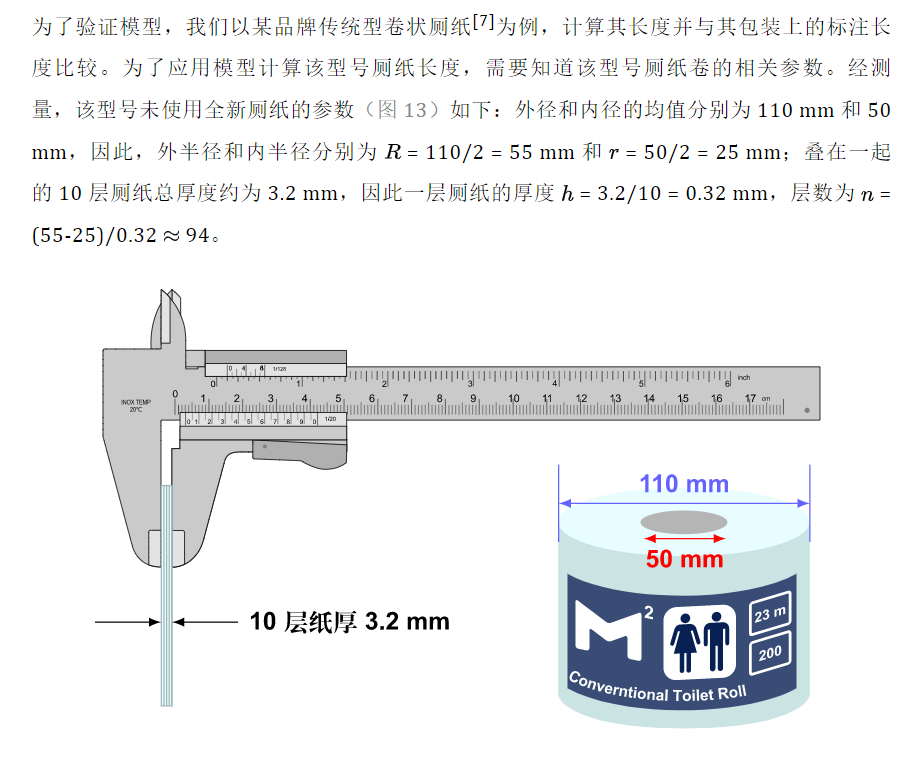 將這些參數分別代入同心圓(等面積)、螺旋線和更懂卷模型,得到各模型算得的廁紙長度分別為 23562 mm,23562 mm 和 23556 mm。幾種模型給出的結果並沒有什麼明顯差別,都約為 23.6 m。而實際該廁紙包裝上標註的長度為 23 m(圖 13)。模型計算出的廁紙長度與包裝上的標註長度之間相差僅 2.6%