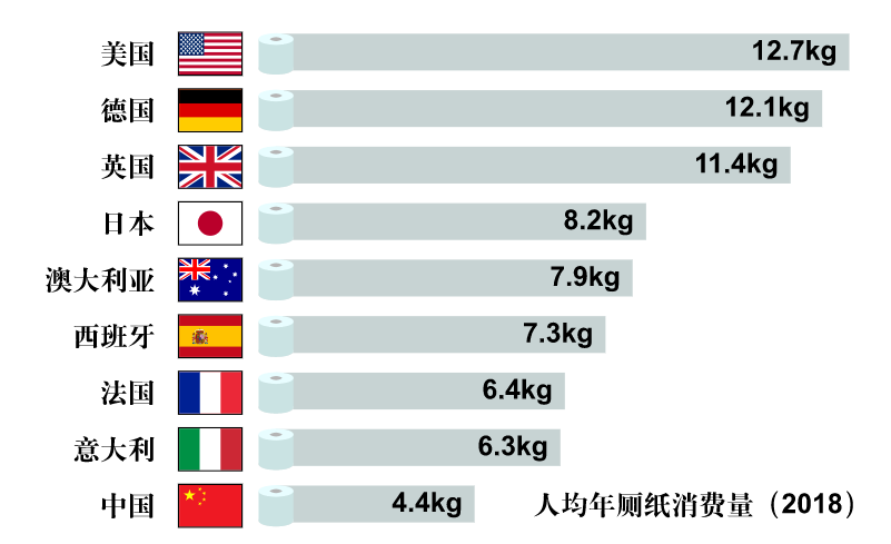 在 2018 年的一項調查[3]中顯示,我國人均生活用紙消費量處於全球較低水平,僅為 4.4 公斤(圖 2)。而自我標榜環保的美國、德國、英國等西方發達國家,無一例外,都是廁紙消費大國。美國人均年廁紙消費量最高,達到了 12.7 公斤。其次是德國和英國,也都超過了 10 公斤。