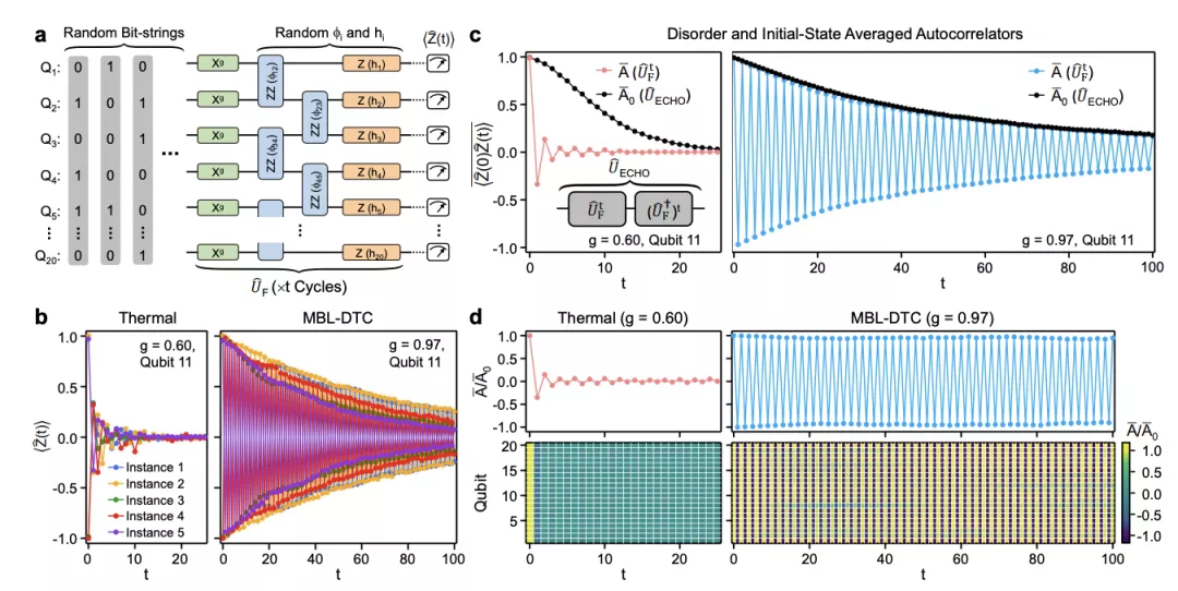圖4 谷歌時間晶體實驗示意圖。(a):製造離散時間晶體的過程,將系統初態製備到二進制字符串態。通過數字量子模擬方法,用量子門電路模擬離散時間晶體的哈密頓量,並在結束時讀取其Pauli-z算符的期望。(b):對於不同初態和失序取平均的離散時間晶體動力學。(c):熱化系統的行為和多體局域化離散時間晶體行為的對比。(d):通過回聲線路進行降噪後獲得的無退相干影響的離散時間晶體動力學。丨來源:谷歌離散時間晶體預印本Observation of Time-Crystalline Eigenstate Order on a Quantum Processor