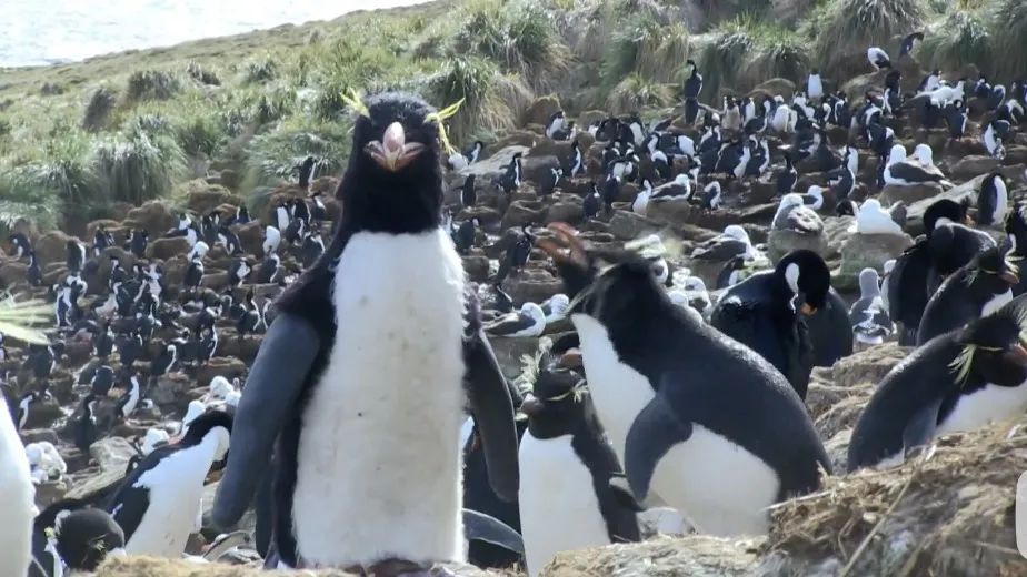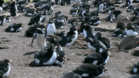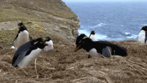 這種企鵝是一夫一妻制,它們在繁殖期的時侯,雄性企鵝會先去生孩子的地方搭窩,然後等待雌性企鵝的到來。