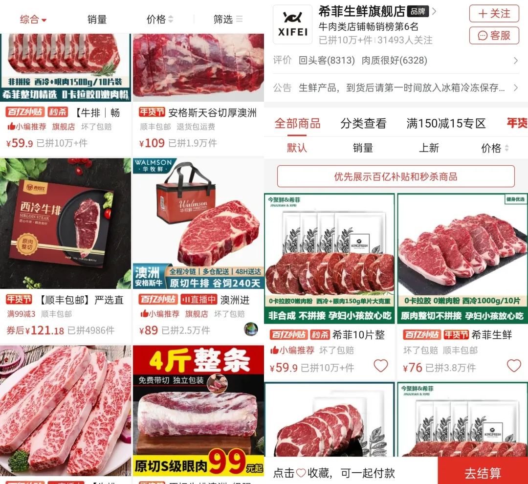 希菲生鮮成立於2012年,是一家總部位於上海的生鮮零售品牌。創始人胡亮向字母榜表示,最近幾周,拼多多開啓年貨節大促,希菲生鮮旗艦店的牛排銷量較去年同期增長4~5倍,整個工廠都在加班加點備貨。
