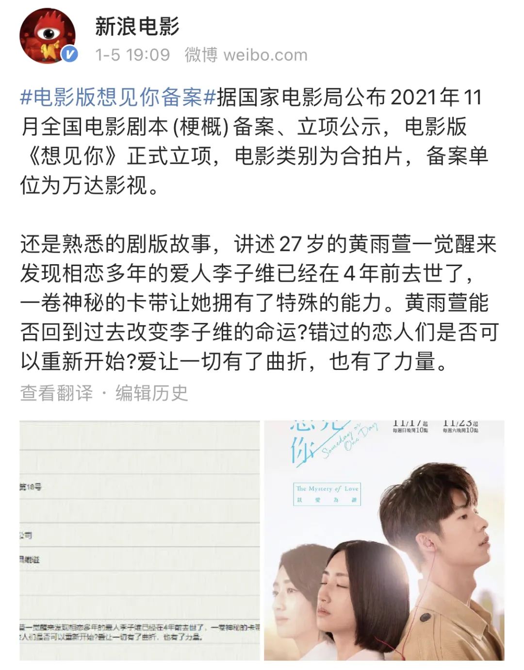 台劇《想見你》的電影版正式立項,原班人馬迴歸。