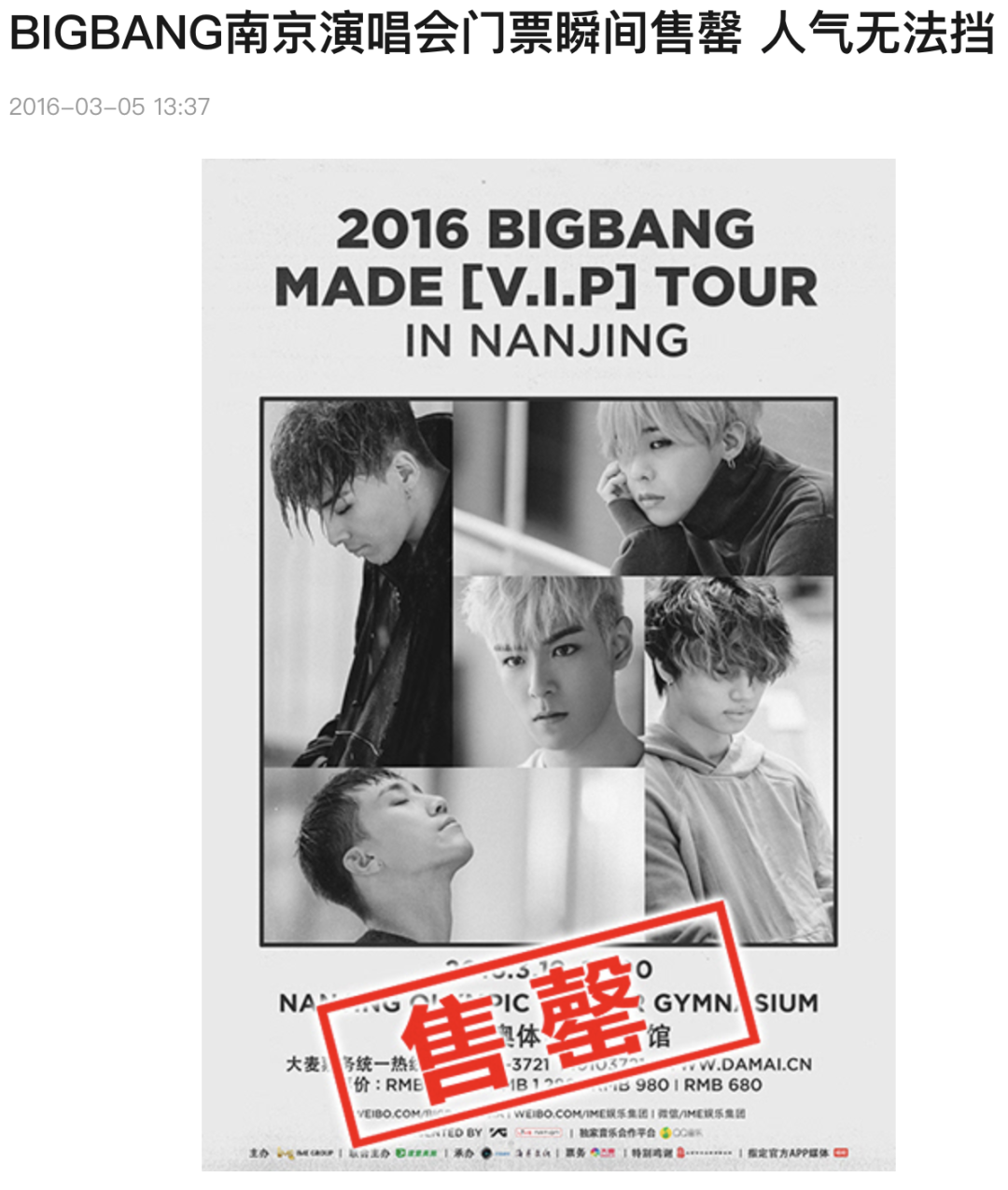 BIGBANG在中國的演唱會,門票瞬間售罄。
