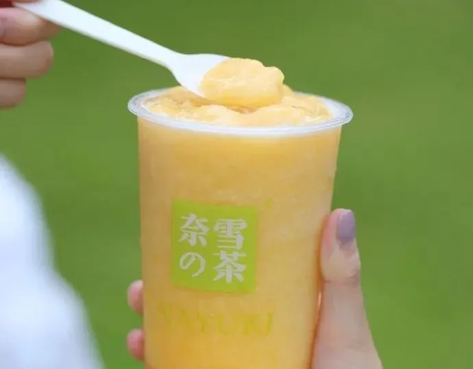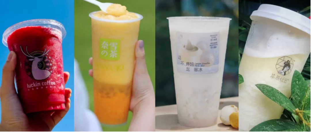 **新流行水果,做成冰沙直接出品:**如喜茶、茶百道推出的龍眼冰,秋天伏小桃等品牌賣柿子、奈雪上新的杏類產品,都是將直接新水果打成冰沙出品。