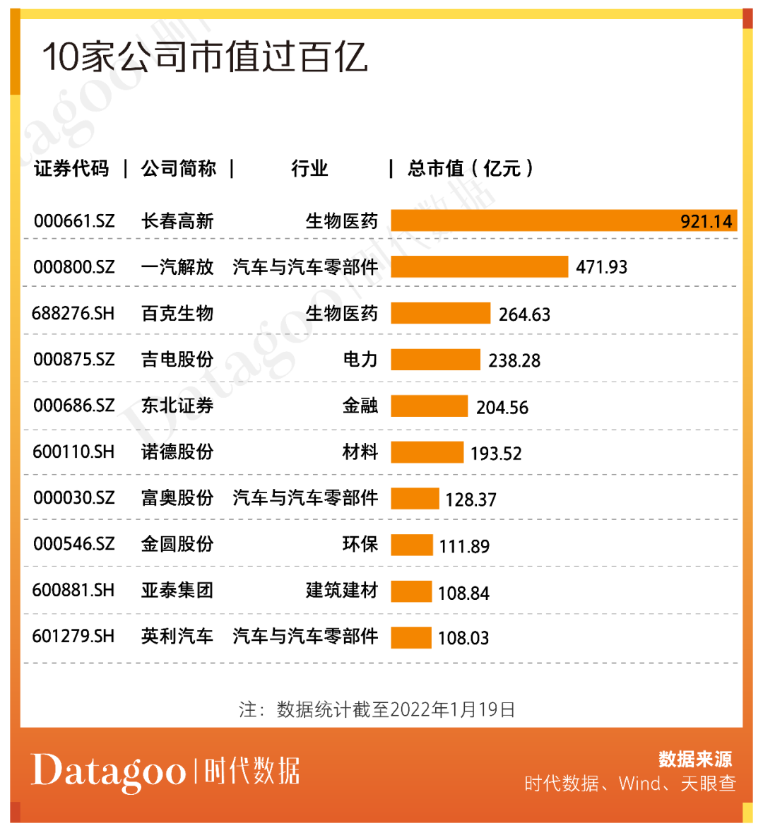 據時代數據統計,截至2022年1月19日,一共有10家公司市值超過100億元。其中,長春高新(000661)市值第一,達到921.14億元;其次是一汽解放(000800),市值達到471.93億元;第三是國內水痘疫苗領域龍頭企業百克生物(688276),市值達到264.63億元。