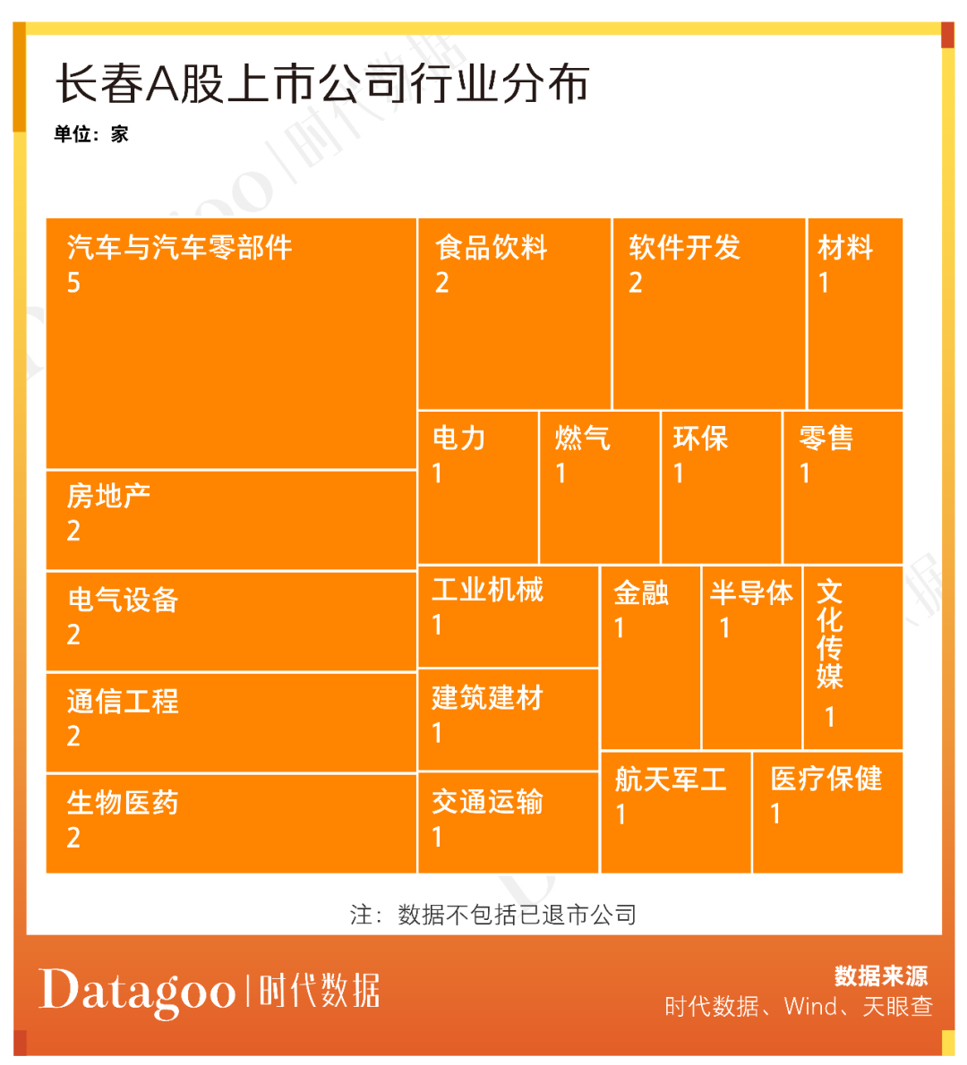 汽車產業是長春的支柱產業,因此來自汽車產業的上市公司也最多。**據時代數據統計,在這30家公司中,來自汽車與汽車零部件行業的公司有5家。**其後,房地產、電氣設備、通信工程、生物醫藥、食品飲料、軟件開發等行業各有2家公司上市;材料、電力、燃氣、環保、零售、金融、半導體、工業機械、建築建材、交通運輸、航天軍工、醫療保健、文化傳媒等行業各有1家公司上市。