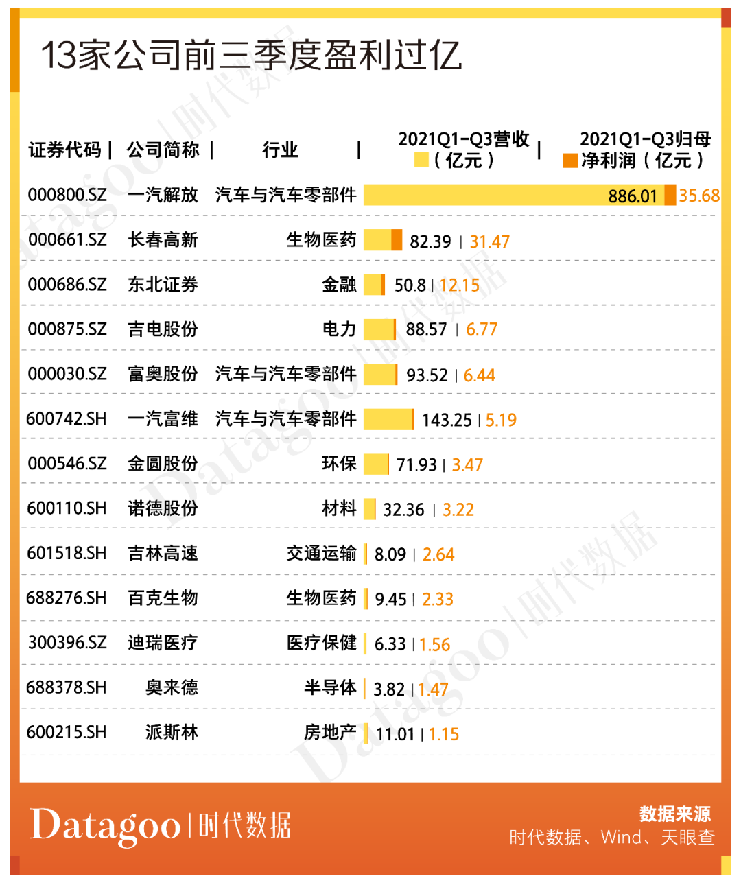 其中,一汽解放(000800)業績居首,前三季度營收886.01億元、歸母淨利潤35.68億元。其後,國內生物製品行業領先企業長春高新(000661)前三季度營收82.39億元、歸母淨利潤31.47億元,屈居次席。此外,東北證券(000686)前三季度營收50.8億元、歸母淨利潤12.15億元,位居第三。
