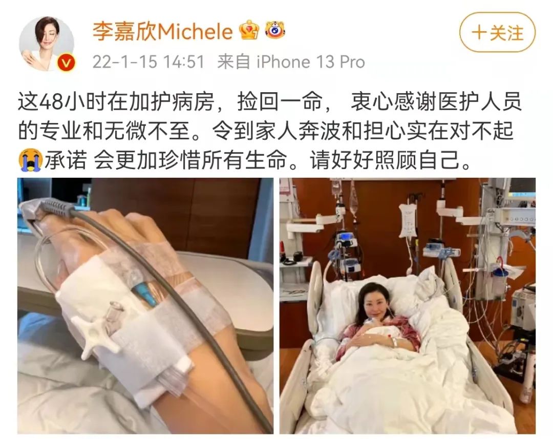 前幾天,李嘉欣發了一條微博,自曝在ICU搶救,撿回一命: