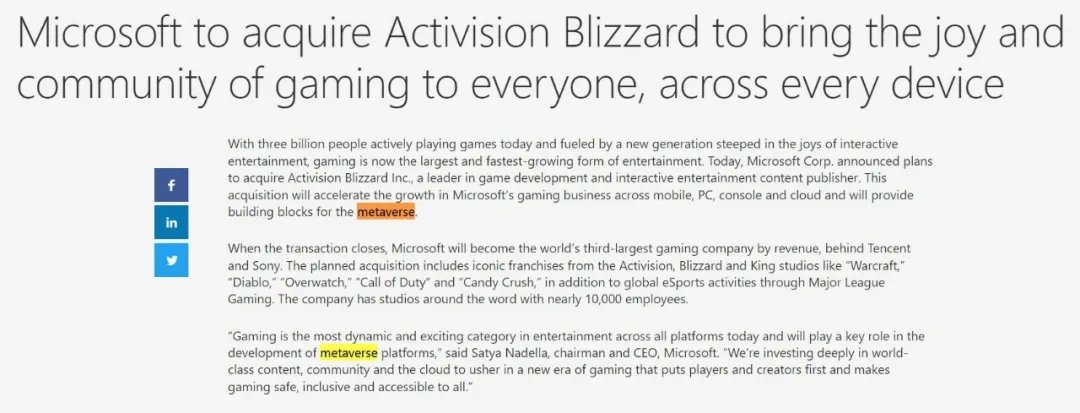 不管是央視還是紐約時報的報道,也都把微軟這次史無前例的收購,解讀為對元宇宙市場的提前佈局,是科技公司在未來發展上的綜合競爭。