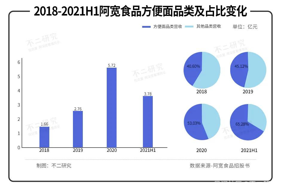 與同行競對相比,阿寬食品的體量仍然太小。財報顯示,2021年上半年,康師傅的方便麪業務收益為127.22億元;統一企業中國的方便麪業務收入為43.98億元。中華全國工商業聯合會數據顯示,正在謀劃上市的今麥郎2020年營收達到218.49億元。三家巨頭營收規模皆遠超阿寬食品。