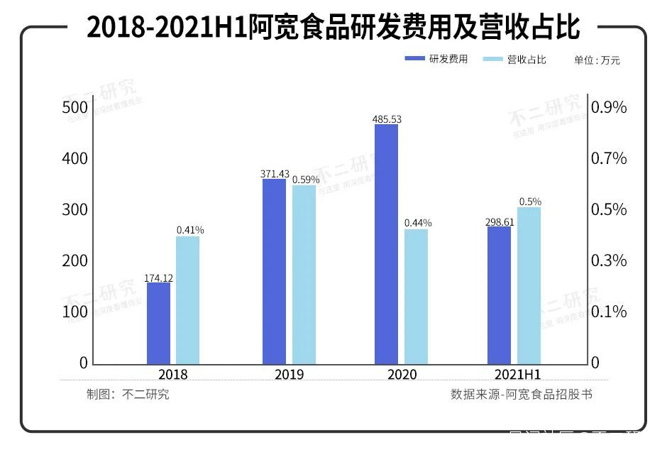 招股書顯示,2018~2021年上半年,阿寬食品的研發費用佔營收比重分別為0.41%、0.59%、0.44%和0.50%;截至2021年6月底,公司研發人員僅39名,佔員工比重為2.3%。