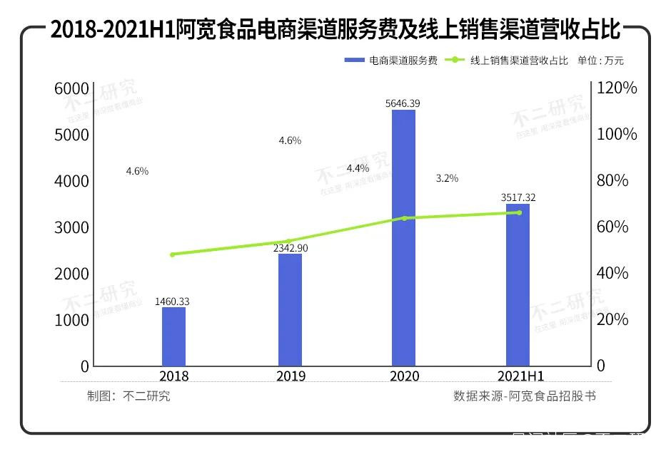 與之相對應的是電商推廣費用的高企。招股書顯示,2018~2021年上半年,阿寬食品的電商渠道服務費分別為1460.33萬、2342.90萬、5646.39萬和3517.32萬元。也就是説,在2020年2.3億的電商自營收入中,有近25%需要作為推廣費用支付給電商平台和主播。