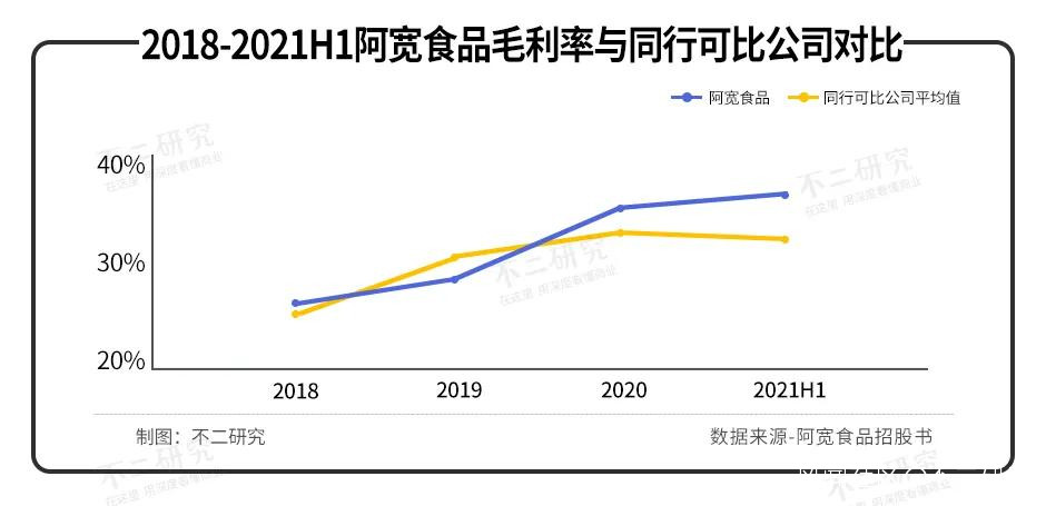 毛利率增長的轉折點則來得更早。招股書顯示,2018~2021上半年,阿寬食品的主營業務毛利率分別為37.51%、36.22%、29.31%和27.54%。從2020年開始,阿寬食品的毛利率逐年下降,並喪失市場優勢,低於行業平均值。