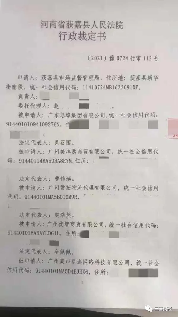 據媒體披露的獲嘉縣人民法院的行政裁決書顯示,河南省獲嘉縣市場監督管理局在查處廣州美埠購商貿有限公司等關聯企業涉嫌傳銷資金一案中,為防止被申請人轉移或隱匿涉傳資金,對涉案證據申請保全,決定向獲嘉縣人民法院申請對廣東思埠集團有限公司、廣州美埠購商貿有限公司、廣州常拓物流代理有限公司、廣州優智商貿有限公司、廣州集市星選網絡科技有限公司、無花果樂園(廣州)傳媒有限公司、廣州真靠譜商貿有限公司等涉嫌銀行賬户進行凍結。獲嘉縣法院近日作出裁定,共計凍結資金額度達2億元。