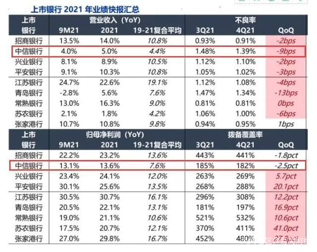 除此之外,中信銀行錄得淨利556.41億元,19-21年複合增長率僅為7.6%。截至17日,在9家披露業績預告的銀行中,中信銀行是唯一一家淨利增長率低於20%、淨利複合增長率低於10%的銀行。