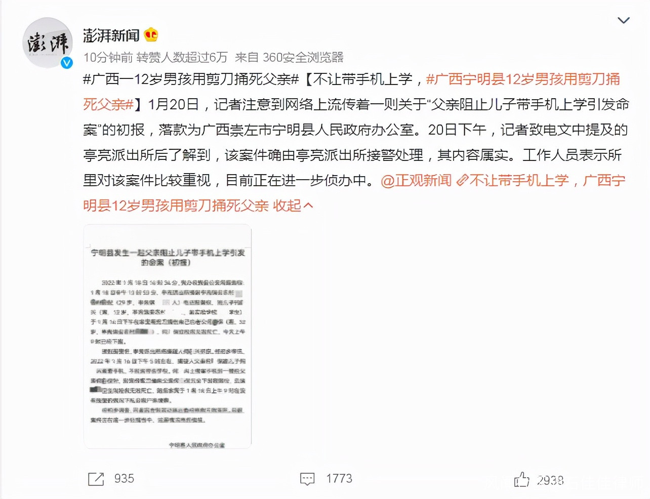 據澎湃新聞報道,1月16日下午,廣西寧明縣12歲男孩何某興因父親何某保不準其帶手機上學,交手機時趁父親不備,用剪刀刺向父親頸部,導致父親死亡。