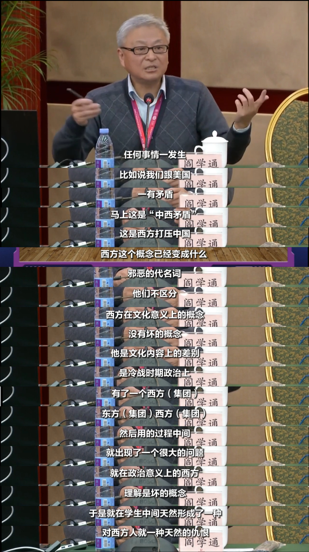 現在東方沒了,西方這概念還在使用,然後用的過程中間就出現了一個很大的問題,什麼問題?就是把西方這個政治概念,就在政治意義上的西方理解為是壞的概念,於是就在學問中間天然形成了一種就是説對西方人就一種天然的仇恨,這是一個比較大的問題。