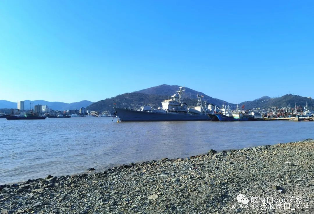 泊靠在寧波石浦漁港上已退役的南京艦(拍於石浦鎮對面的東門島)