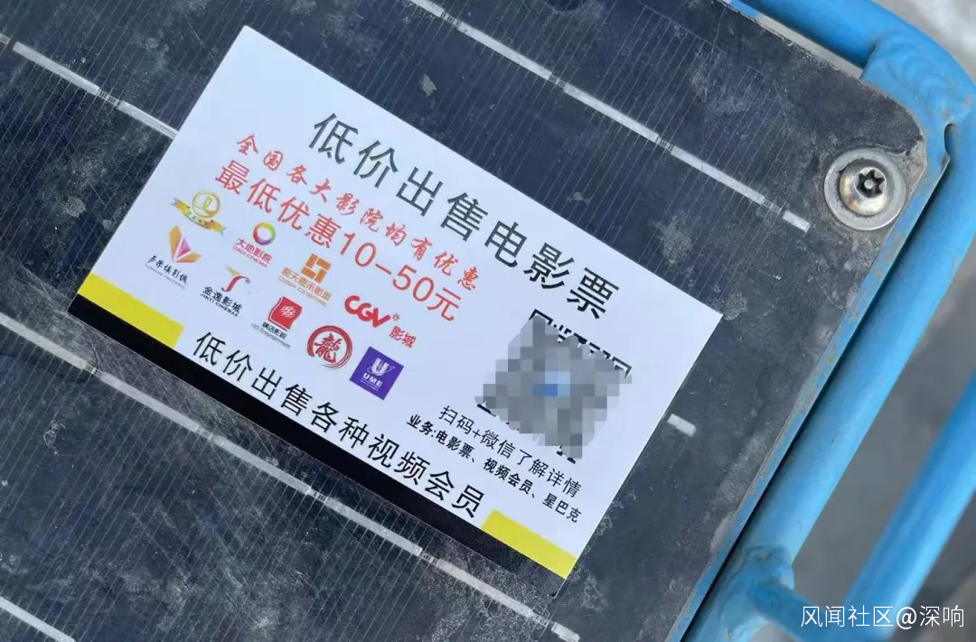 在貼吧、豆瓣、知乎等平台,搜索“低價電影票”,隨處可以看見票販投放的大量“揭秘類”的軟文;在線下掃碼騎車時也可以看見類似的小卡片投放。