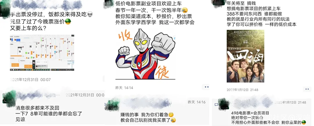 多刷幾篇投放的軟文後大致可以總結出行文的套路:先介紹低價電影票的行情很好,尤其是現在票房冠軍能高達50多億,中間的利潤很高;然後普及一些正確薅羊毛的手段,並站在買家的角度循循善誘,利人利己,復購率高;最後展示自己的交易記錄、掙了多少錢,並稱這是可以月入過萬的副業,再附帶上微信號收尾。