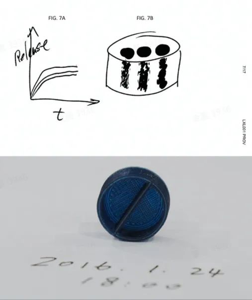 專利手繪稿及第一個 3D 打印藥片 | 來源:三迭紀