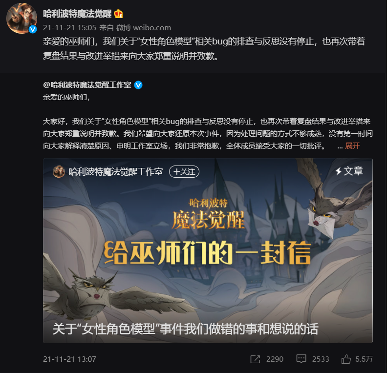 直到11月21日,@哈利波特魔法覺醒 發佈了長文《關於“女性角色模型”事件我們做錯的事和想説的話》,表示“內容審核團隊已經徹底更換,核心決策團隊也正在進行嚴肅的內部處理和集體反思”之後,玩家的抗議聲才漸漸消失。