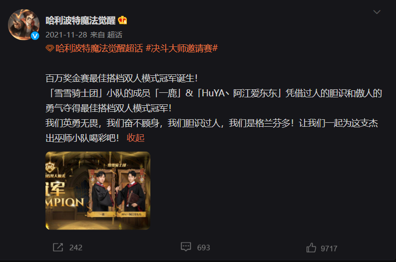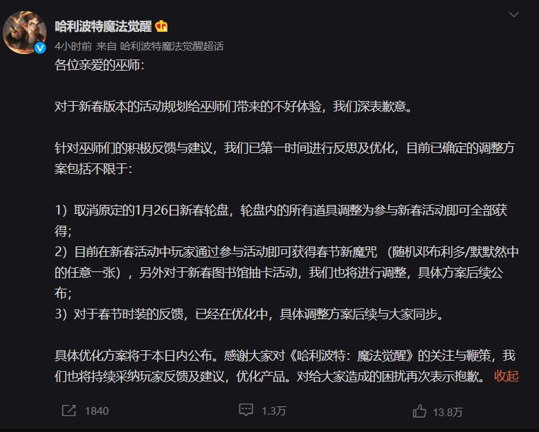 重壓之下,在登上熱搜第一2小時後,@哈利波特魔法覺醒 發微博致歉,稱將取消部分活動,具體優化方案將在本日公佈。