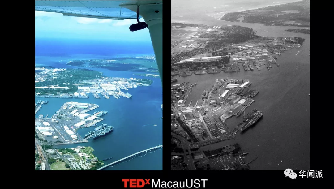 接着,他又給華聞君看了另一張照片,這是他在空中,幾乎以相同角度拍下的珍珠港。“你可以看到,現在的珍珠港,和那時比幾乎沒有任何變化。”