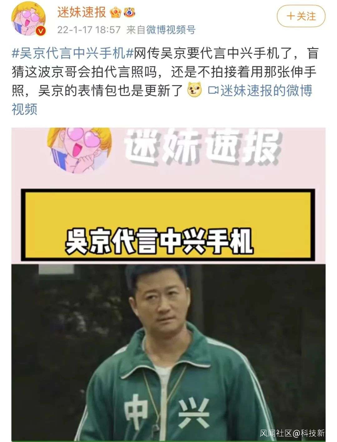 1月17日晚,中興通訊高級副總裁、中興通訊終端事業部總裁倪飛在微博曬出了一件印有“中國”二字的運動外套。隨後,中興官方微博轉發並附文“尋衣服主人”。網友敏鋭地發現,這件外套正是吳京熱門表情包中的同款外套。同日,中興終端舉行的媒體溝通會上,倪飛宣佈吳京成為中興手機代言人。稍晚時候,眾多娛樂博主和科技博主發佈了#吳京代言中興手機#話題博文,並將該話題送至微博的時事熱點。
