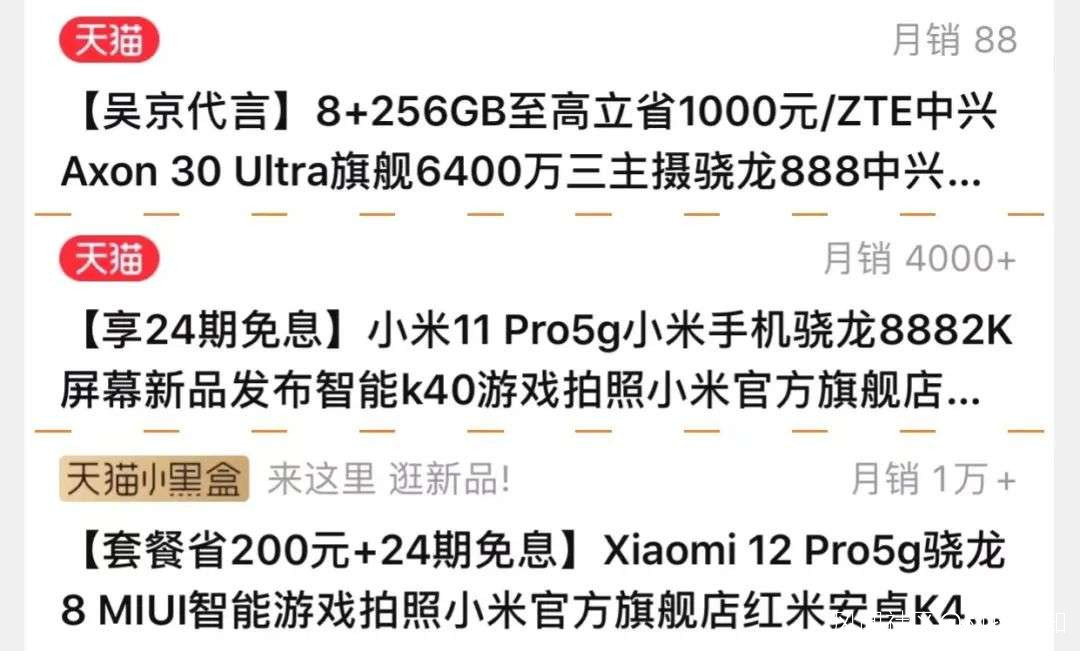 更重要的是,在小米天貓官方旗艦店內,目前銷量最高的中高端手機是小米12 Pro。相較於小米11 Pro和中興Axon 30 Ultra,小米12 Pro搭載了性能相對更優的驍龍8 Gen1處理器,雖然同內存版本的售價比前兩者高了1000元左右,但是更受市場歡迎,月銷量在1萬以上。