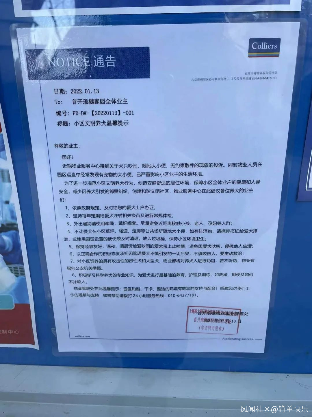 為了瞭解情況,記者首先致電首開琅樾物業——北京高力國際物業服務有限公司,工作人員告訴記者,小區裏包括幾隻大型犬在內都辦有狗證,物業對文明養犬會定期宣傳,對於不文明養犬的業主,會進行勸導,但不具備強制力: