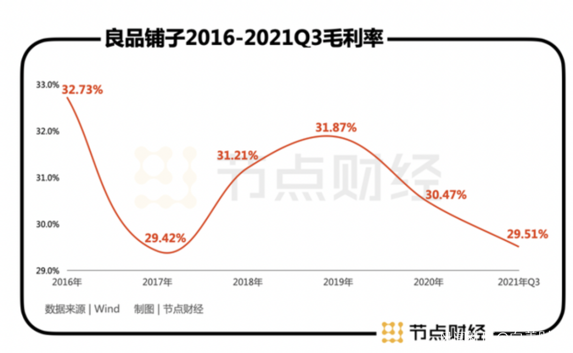 增長動能的下降,也體現在毛利率的持續下滑上。財報顯示,從2019年到2021年第三季度,良品鋪子毛利率持續下滑。