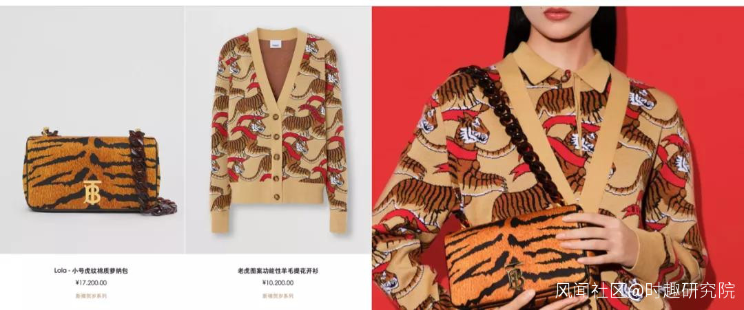 Burberry則是以老虎的動物印花為元素,在Lola 蘿納包、派對風絲質半裙、提花精紡針織精品等上都有大面積的使用,在圖案印花上,老虎也呈現出了一種中國風的味道。