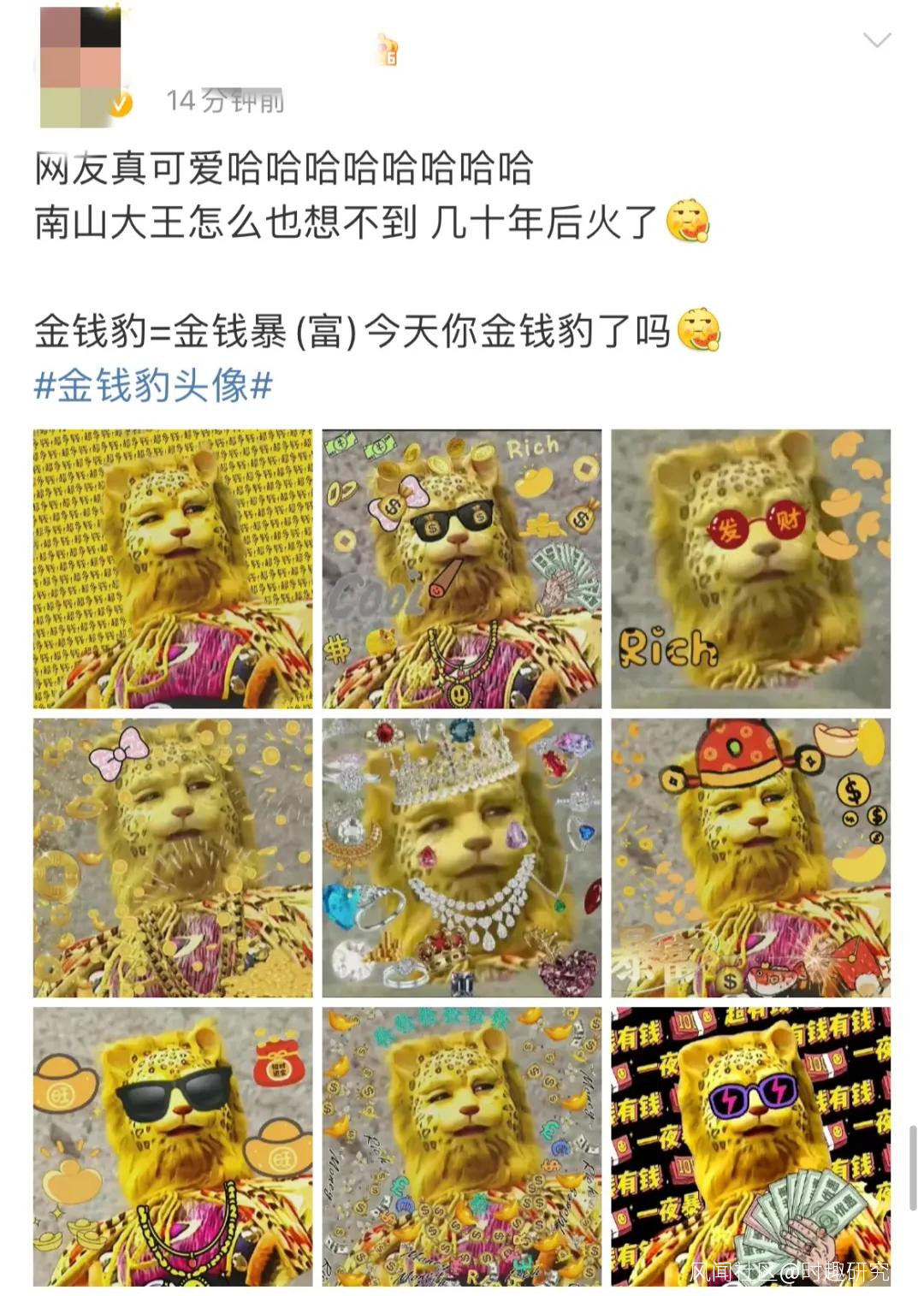 例如最近《西遊記》裏的金錢豹突然火了,一方面是因為金錢豹也屬於貓科動物,有不少網友覺得虎年來了,金錢豹挺符合這個春節氛圍的,另一方面,金錢豹還有諧音梗,金錢暴富。正因如此,網友們紛紛換上了金錢豹的頭像,還DIY了不少風格、款式的,在網上引起了不少的討論。