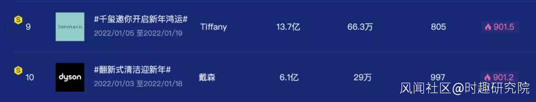 從抖音平台近一個月的品牌營銷戰役TOP10來看,品牌種類跨度更多,珠寶、母嬰、家電、服飾等均有上榜戰役。在營銷策略方面,以「新」為主題,新年新氣象的戰役居多,同時,還有明星營銷等策略方式。
