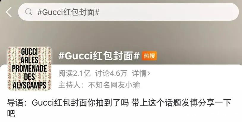 就拿去年來説,很多人沒有意料到最終拯救春節營銷是微信紅包封面,當微信紅包封面火了後,不少品牌臨時出創意,趕上這趟末班車。其中Gucci的紅包封面一度上了熱搜,還引起網友們的調侃,從品牌角度來説,Gucci的春節紅包營銷算是贏了。