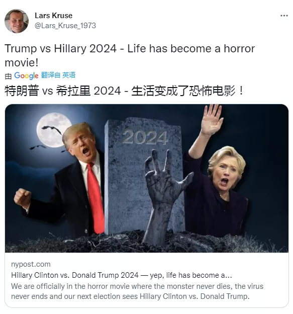 《紐約郵報》發表了一篇文章,標題就是《特朗普VS希拉里2024——是的,生活變成了恐怖電影 》。