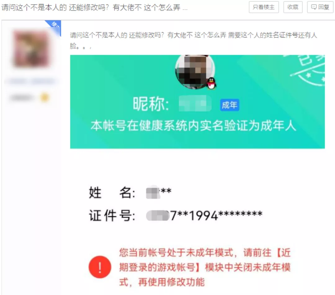 比如下面這位就表示,自己的實名認證信息,被改成了未成年人。