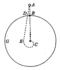 In requital of this advertisement I shall communicate to you a fansy of my own about discovering the earth’s diurnal motion. In order thereto I will consider ye Earth’s diurnal motion alone without ye annual, that having little influence on ye experimt I shall here propound. Suppose then BDG represents the Globe of ye Earth carried round once a day about its center C from west to east according to ye order of ye letters BDG; & let A be a heavy body suspended in the Air & moving round with the earth so as perpetually to hang over ye same point thereof B. Then imagin this body B let fall & it’s gravity will give it a new motion towards ye center of ye Earth without diminishing ye old one from west to east. Whence the motion of this body from west to east, by reason that before it fell it was more distant from ye center of ye earth then the parts of ye earth at wch it arrives in its fall, will be greater then the motion from west to east of ye parts of ye earth at wch ye body arrives in it’s fall: & therefore it will not descend in ye perpendicular AC, but outrunning ye parts of ye earth will shoot forward to ye east side of the perpendicular describing in it’s fall a spiral line ADEC, quite contrary to ye opinion of ye vulgar who think that if ye earth moved, heavy bodies in falling would be outrun by its parts & fall on the west side of ye perpendicular. The advance of ye body from ye perpendicular east- ward will in a descent of but 20 or 30 yards be very small & yet I am apt to think it may be enough to determin the matter off act. Suppose then in a very calm day a Pistol Bullet were let down by a silk line from the top of a high Building or Well, the line going through a small hole made in a plate of Brass or Tinn fastened to ye top of ye Building or Well & yt ye bullet when let down almost to ye bottom were setled in water so as to cease from swinging & then let down further on an edge of steel lying north & south to try if ye bullet in setling thereon will almost stand in 12quilibrio but yet with some small propensity (the smaller ye better) decline to ye west side of ye steel as often as it is so let down thereon. The steel being so placed underneath, suppose the bullet be then drawn up to ye top & let fall by cutting clipping or burning the line of silk, & if it fall constantly on ye east side of ye steel it will argue ye diurnall motion of ye earth. But what ye event will be I know not having never attempted to try it. If,any body may think this worth their triall the best way in my opinion would be to try it in a high church or wide steeple the windows being first well stopt. For in a narrow well ye bullet possibly may be apt to receive a ply from ye straitned Air neare ye sides of ye Well, if in its fall it come nearer to one side then to another. It would be convenient also that ye water into wch ye bullet falls be a yard or two deep or more partly that ye bullet may fall more gently on ye steel, partly that ye motion wch it has from west to east at its entring into ye water by meanes of ye longer time of descent through ye water, carry it on further eastward & so make ye experiment more manifest. [2]