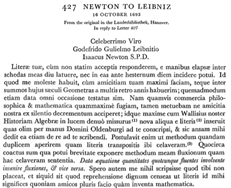 該圖摘自牛頓書信集(英文名為《The Correspondence of Issac Newton》)[7]第208封,在1677年的五月或者六月,我們可以清晰的看到萊布尼茲已經可以熟練的使用他的積分號並進行相關的運算了。至此,我們起碼可以斷定,萊布尼茲的微積分的產生不會晚於這個時間,而微積分基本定理的產生,從文章發表這個角度來説,萊布尼茲在1675年年末建立了微積分基本定理,而其論證在1693年給出。因此我們姑且可以證實,萊布尼茲關於微積分的研究在1675-1677年就已經完成的差不多了,而微積分基本定理的給出略晚,約1677年。因此萊布尼茲的微積分體系完全建立晚於1677年。下面我們看看牛頓在幾乎同時期的工作。