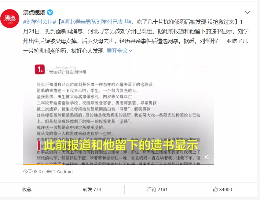 今天凌晨的時候,河北邢台尋親男孩劉學州在微博上發了一篇很長的遺書,遺書的開頭就讓人痛心: