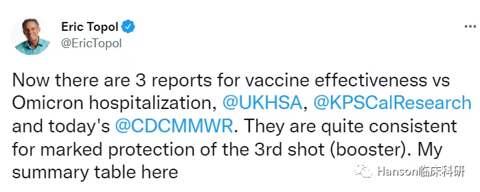 推特大V總結了已經公佈的疫苗預防Omicron突變株住院的有效性【3】,顯示加強接種後,預防Omicron住院的有效性均在88%-90%之間。