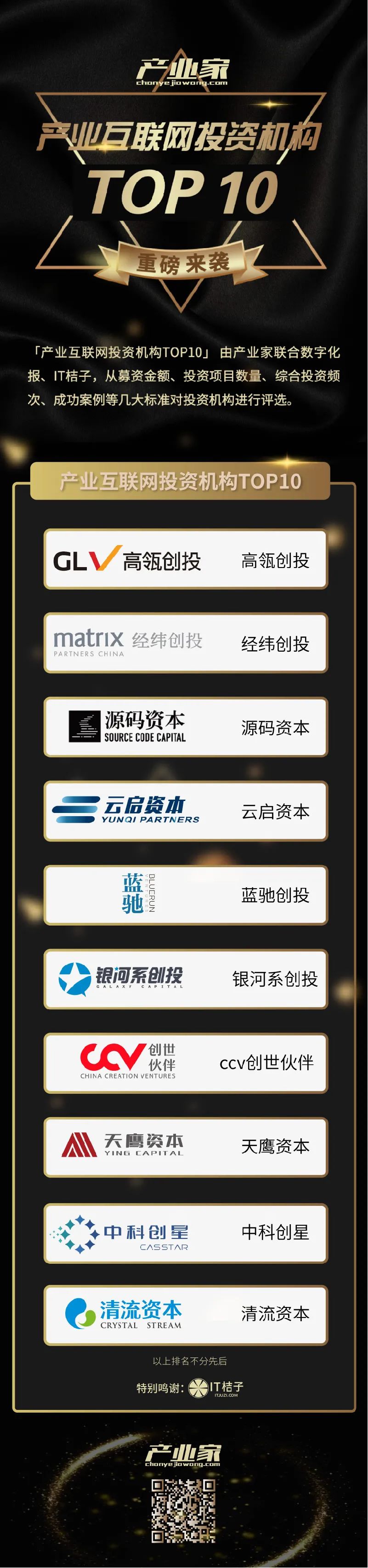 《產業互聯網投資機構TOP 10》設置10個獎項,他們分別是過去一年內對產業互聯網市場影響最大的資本機構。評分標準為募資金額、投資項目數量、綜合投資頻次、明星案例。