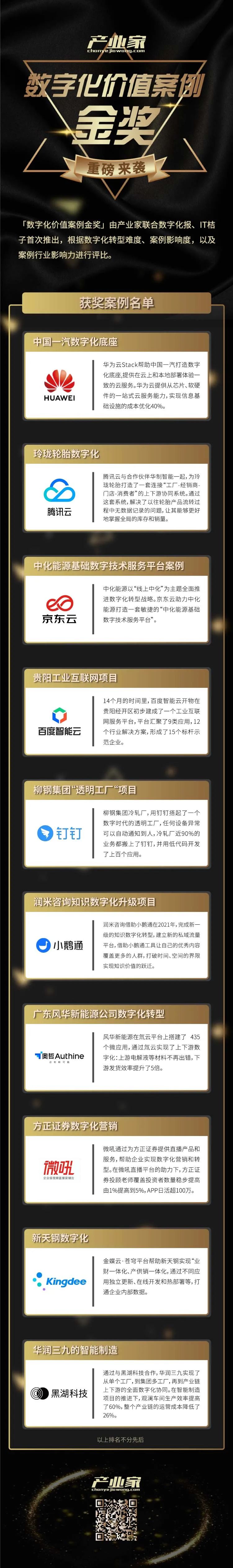 《數字化價值案例金獎》設置10個獎項,他們分別是過去一年裏在整個中國產業數字化轉型中的突出產業案例。評分標準為行業數字化轉型難度、數字化效益,以及案例行業影響力。