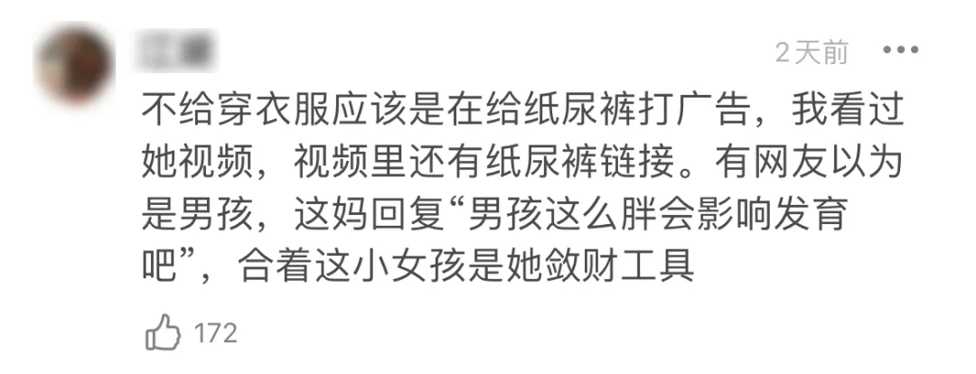 但每次有網友在評論區裏提出建議,都會被罵。於是大家就説小女孩的爸媽為了流量不顧孩子健康,是“網絡啃娃族”,還是極惡劣的那種。