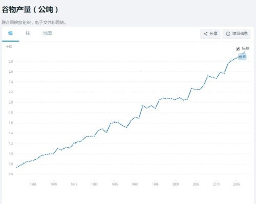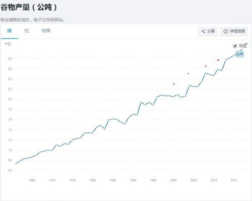 聯合國糧食及農業組織(糧農組織)日前發佈報告稱,2019年世界穀物產量達創紀錄的27.22億噸,比上一年增長2.7%。我們以人均最低水平糧食消費量220千克(也就是不大面積餓死,肉、蛋、奶摺合為糧食)計算,採用聯合國糧農組織整理的世界糧食平均增產速度,以印度人口增長生育率2.2(最低估計水平)計算。