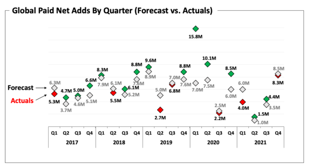 要理解投資者對於Netflix 一季度用户增長預測不佳有這麼大反應,我們需要拿出Netflix過往的用户增長預測和實際數據對比分析一下。